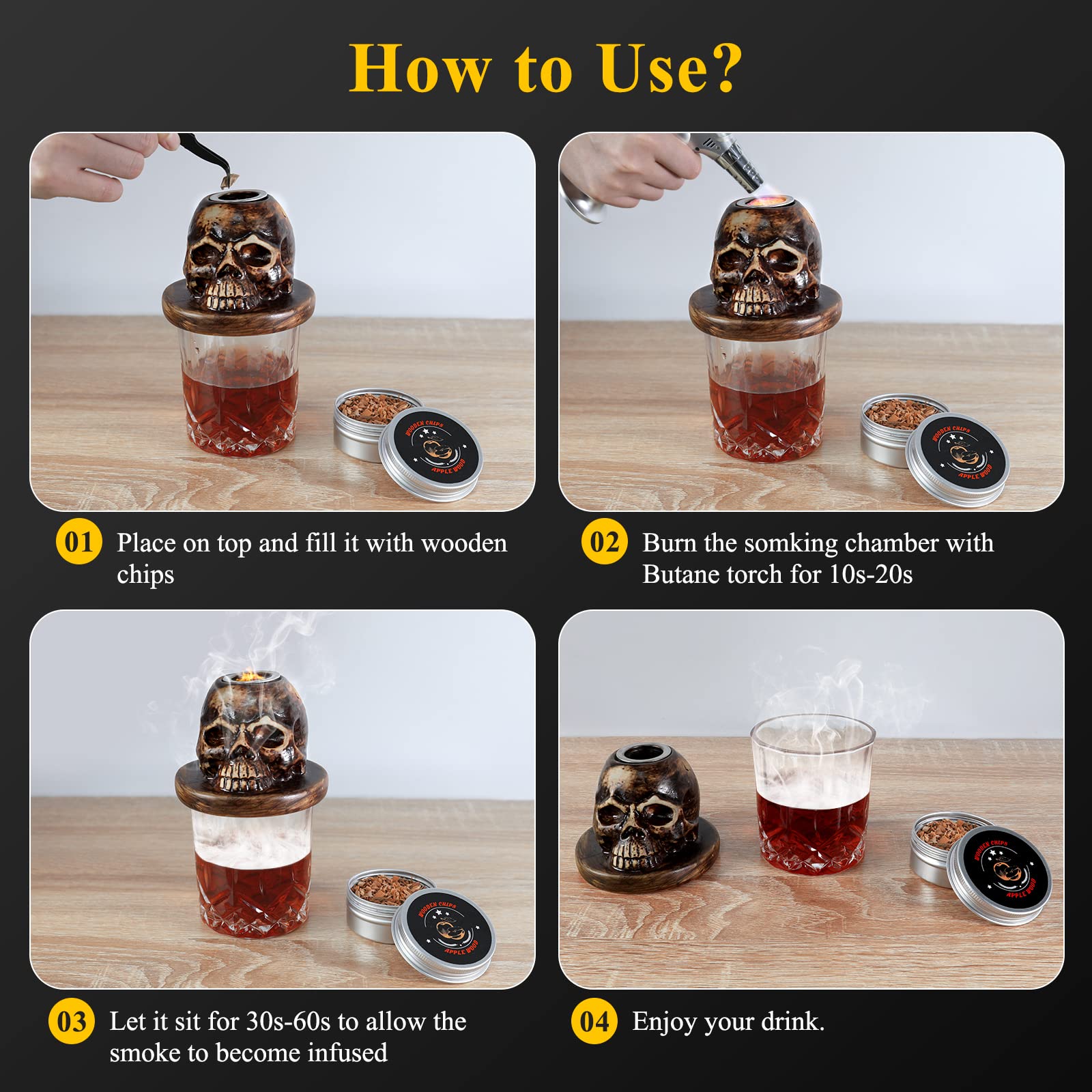 - 【使用简便】:1. 将骷髅头陶瓷烟囱放在盛有鸡尾酒的玻璃杯上。2. 放入木屑,用丁烷喷枪燃烧烟熏室 10-20 秒。3. 静置 30-60 秒,让烟熏味充分融入饮品。4. 尽情享用您的饮品。